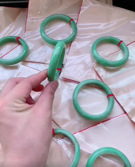 这批手镯最大亮点在于“满色果绿”的稀缺质感——整体色泽均匀饱满,呈现出清新透亮的果绿色调,如同春日新叶般鲜活灵动,自然光下观察,玉色通透不发闷,无明显色块差异,尽显翡翠的温润雅致。同时品相达到“几乎完美”级别,仔细筛选后,手镯圈口规整圆润,边缘打磨光滑,上手佩戴贴合舒适;玉面无明显裂纹、杂点,仅可能存在极细微的天然玉纹(非瑕疵),不影响整体美观与佩戴效果,符合高品质翡翠手镯的标准。