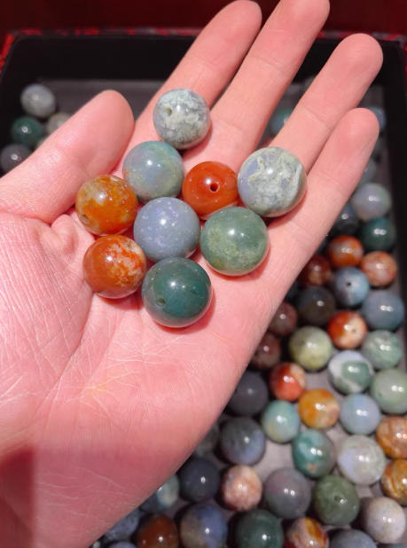 规格:水草玛瑙圆珠 20mm,纹路都是天然形成的,每颗里面的 “水草” 图案都不一样,有的像云雾有的像枝叶,盘玩或做串珠都有特色;还有红油玛瑙 18mm,颜色是那种温润的红,油润感很足,上手显质感,不是普通的通货能比的。